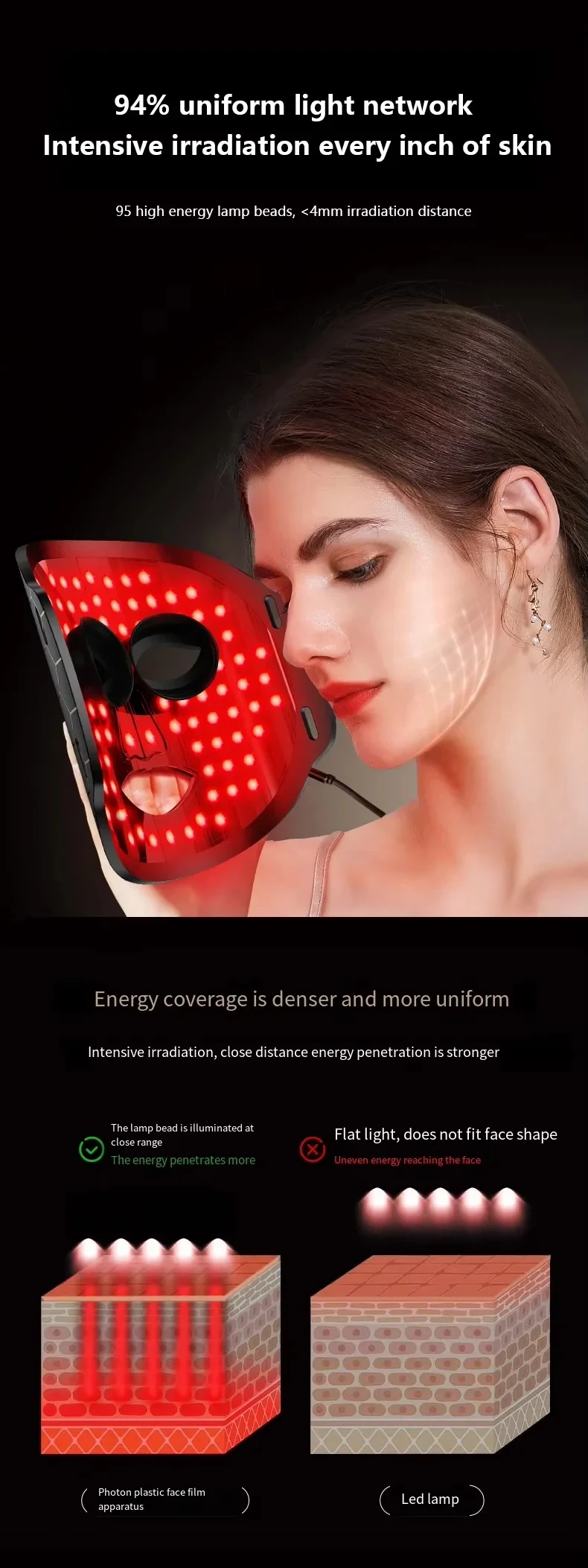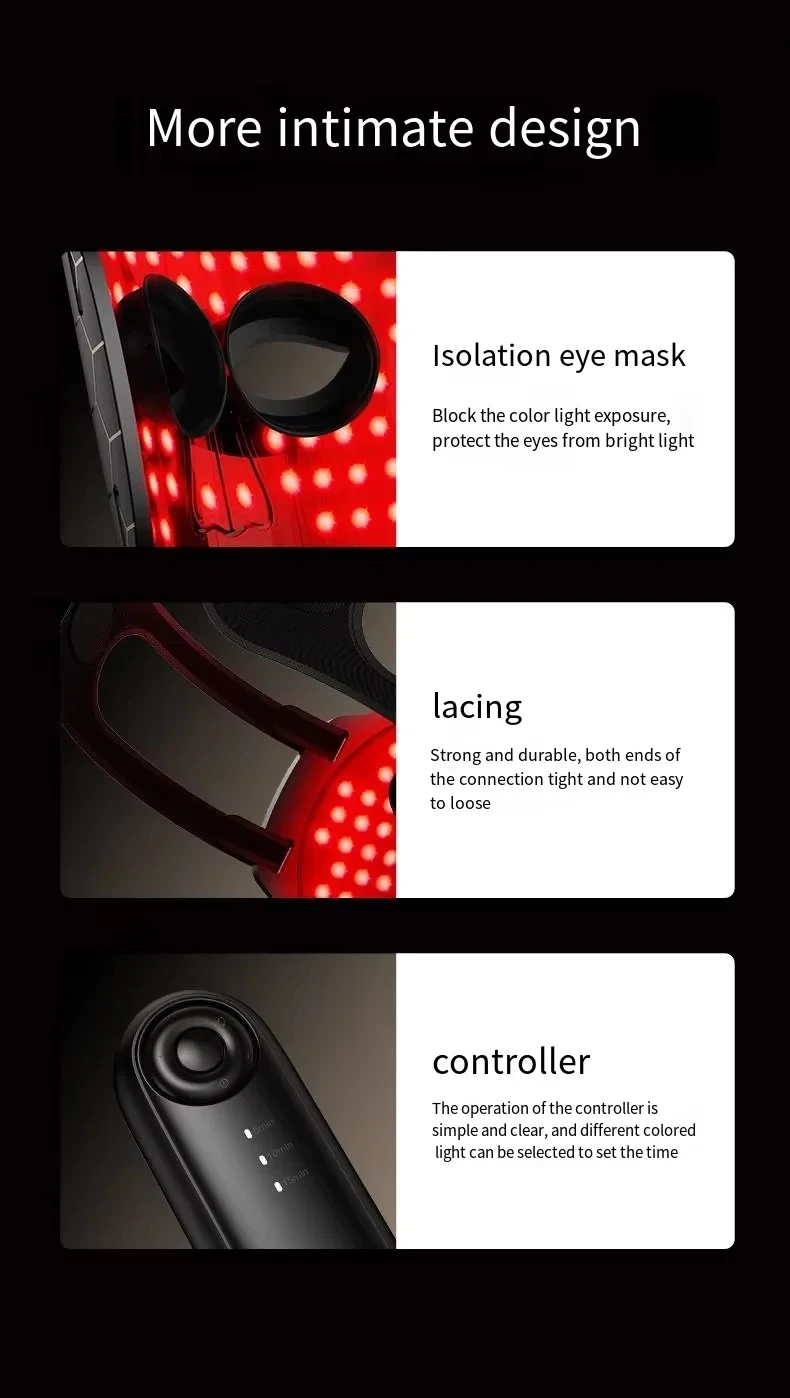 Easy to use: The mask is very easy to use, just apply cleansing agent or facial toner, put on the mask, and turn on the switch. The design of the silicone mask can effectively cover the face, stating that the wearer's facial skin is not affected by light interference, therefore ensuring the stability and accuracy of the treatment effect.