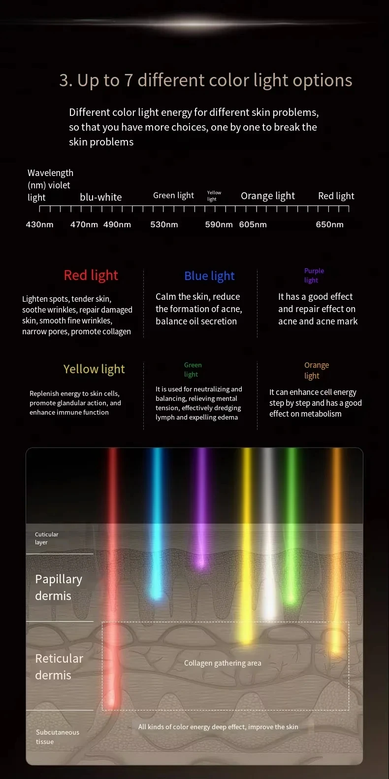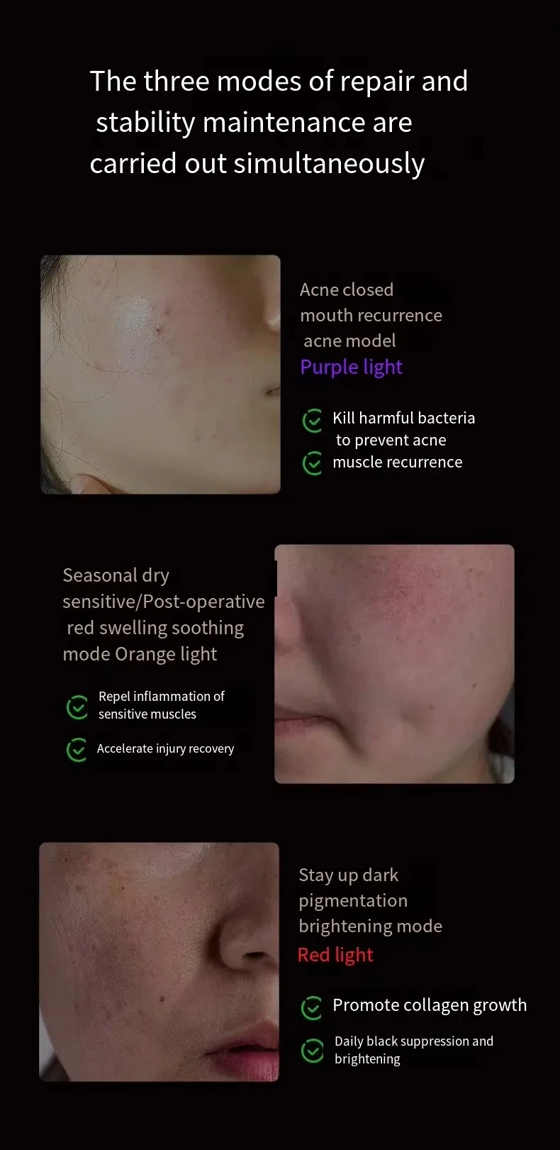 Colored light function: With various colored light functions, this skin regeneration device can effectively reduce facial spots, fine lines, and wrinkles, making the skin smoother, stronger, and younger.